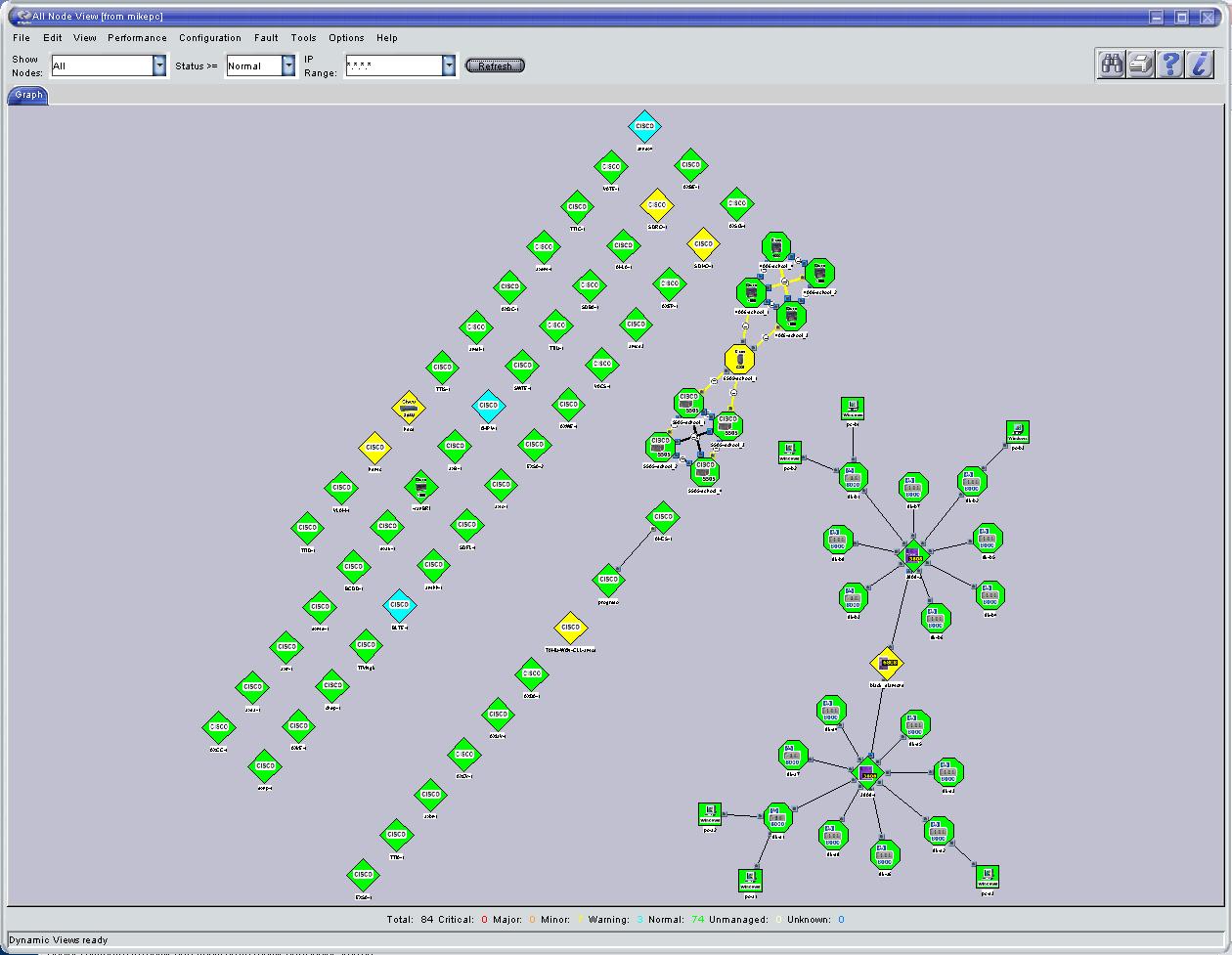 CA Unicenter TNG auto-discovered a simulated network with 6 subnets, with about 20 machines on each subnet. The 2-D and 3-D maps clearly show the topology of the network.